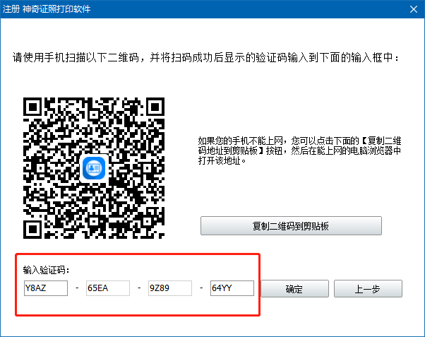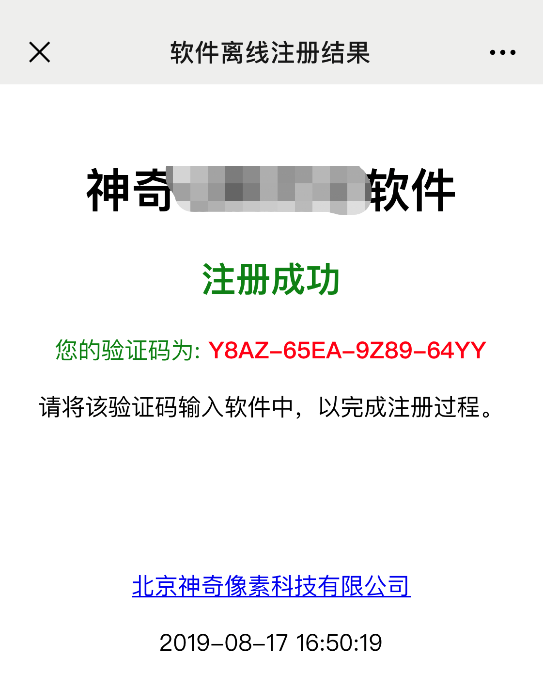 将此页面中的“您的验证码”(红色部分)输入到软件离线注册界面中的“输入注册码”输入框中,如图所示: